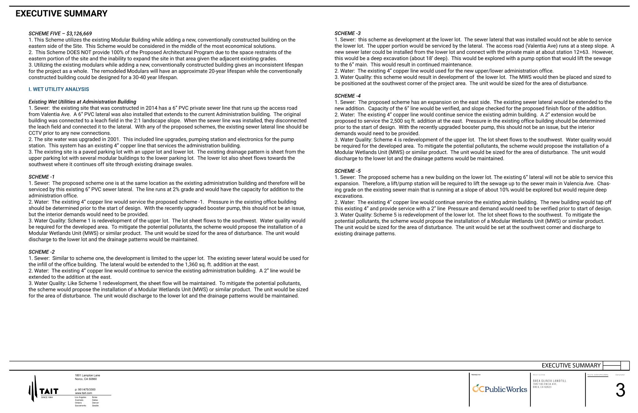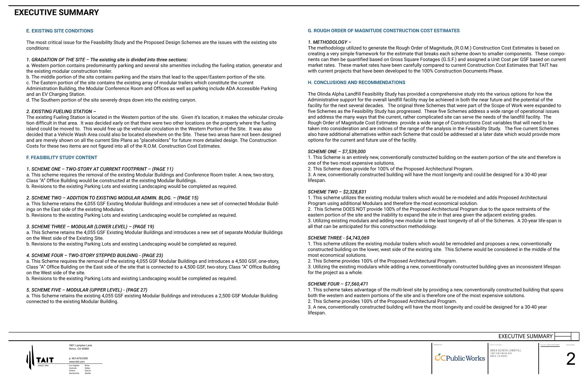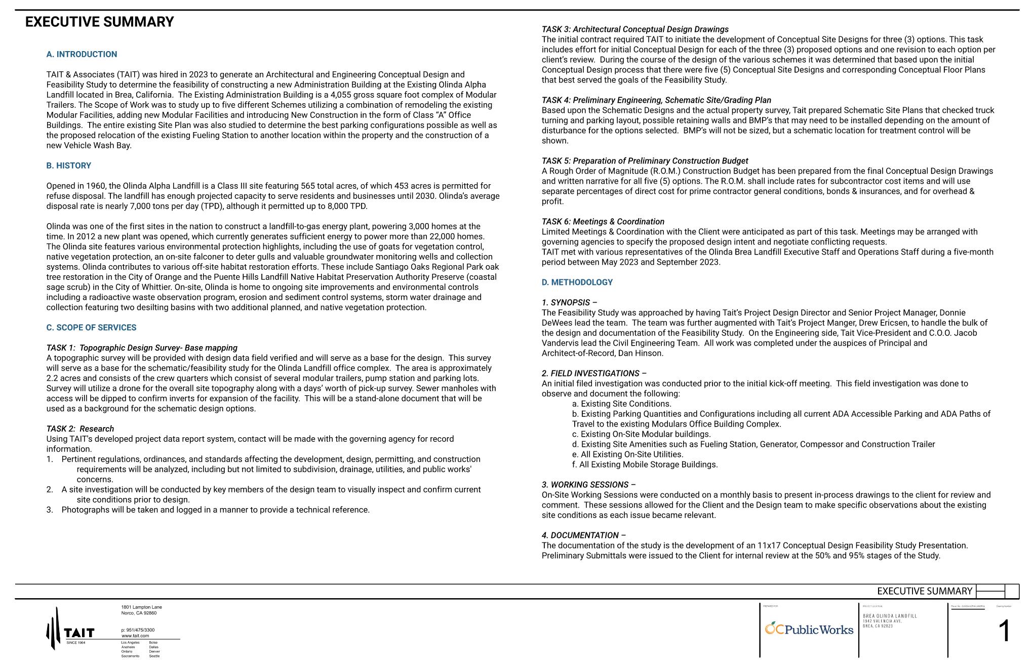 The Olinda Alpha Landfill Administration Building Conceptual Design and Feasibility Study was commissioned to TAIT & Associates by the Orange County Public Works Agency.  The Feasibility Study consists of conducting a complete Site Analysis of the current Site and making a determination of the various options that the Facility may utilize for their Long-Range Planning needs.  Several distinct options were considered from remodeling the existing facility that consists of a group of modular trailers to adding modular trailers to the existing facility and options for constructing a new Administration Building using conventional construction methodologies.